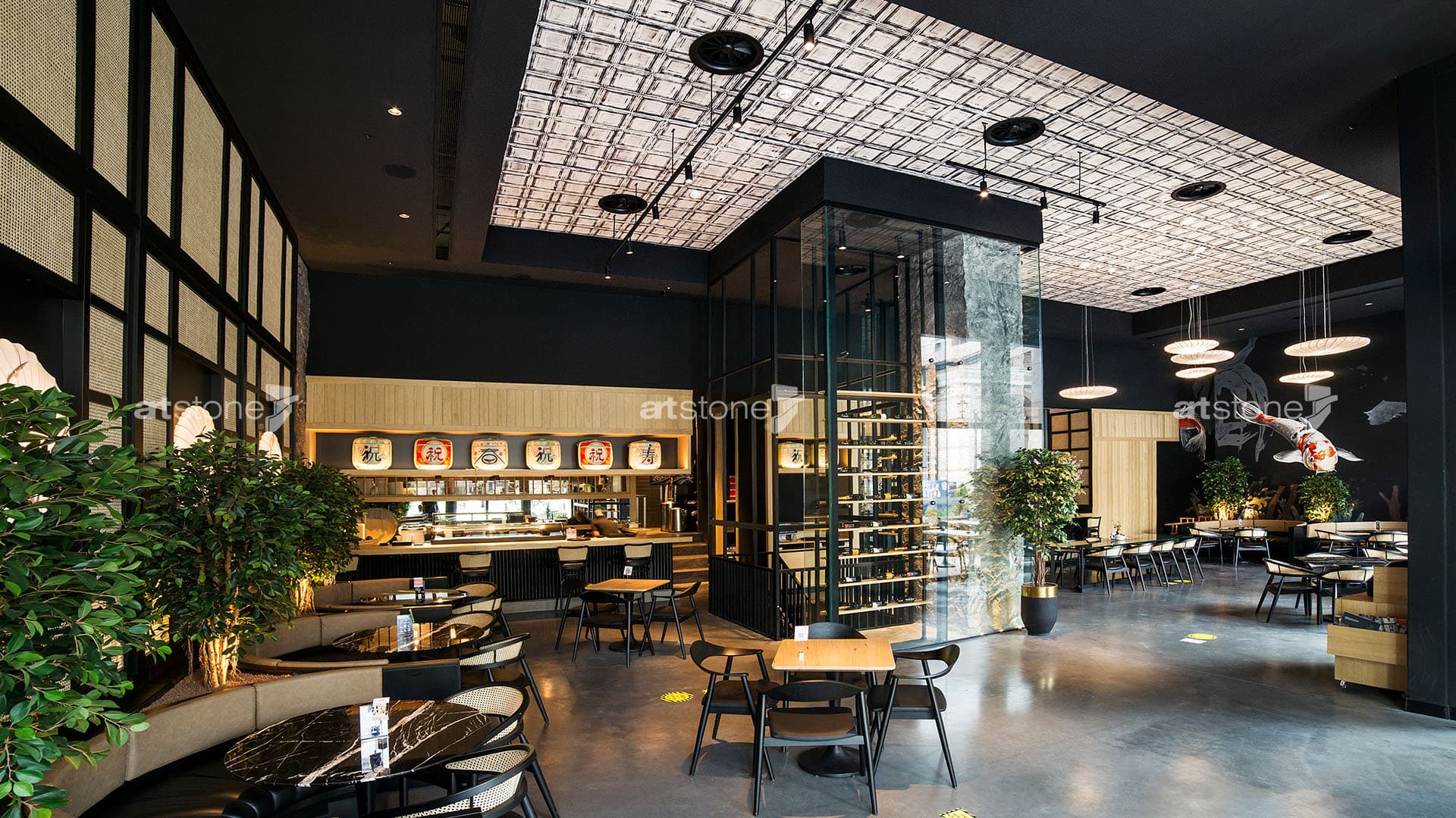 The surfaces of the branch of SushiCo, the famous restaurant chain of Far Eastern cuisine, located in Fişekhane, were designed with Artstone’s decorative wall panels that can be easily mounted on all surface types with superior product quality. The character of the space was shaped by choosing Grenier from the Karoart series on the ceilings and Roca on the interior walls, where the natural rock texture meets the plain and strong lines, referring to the Far East architecture, where magnificent details and designs are seen, apart from the plain appearance.
