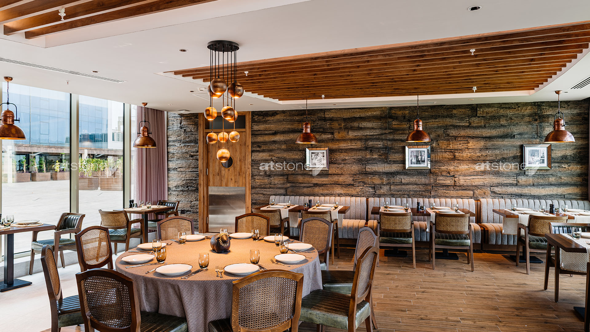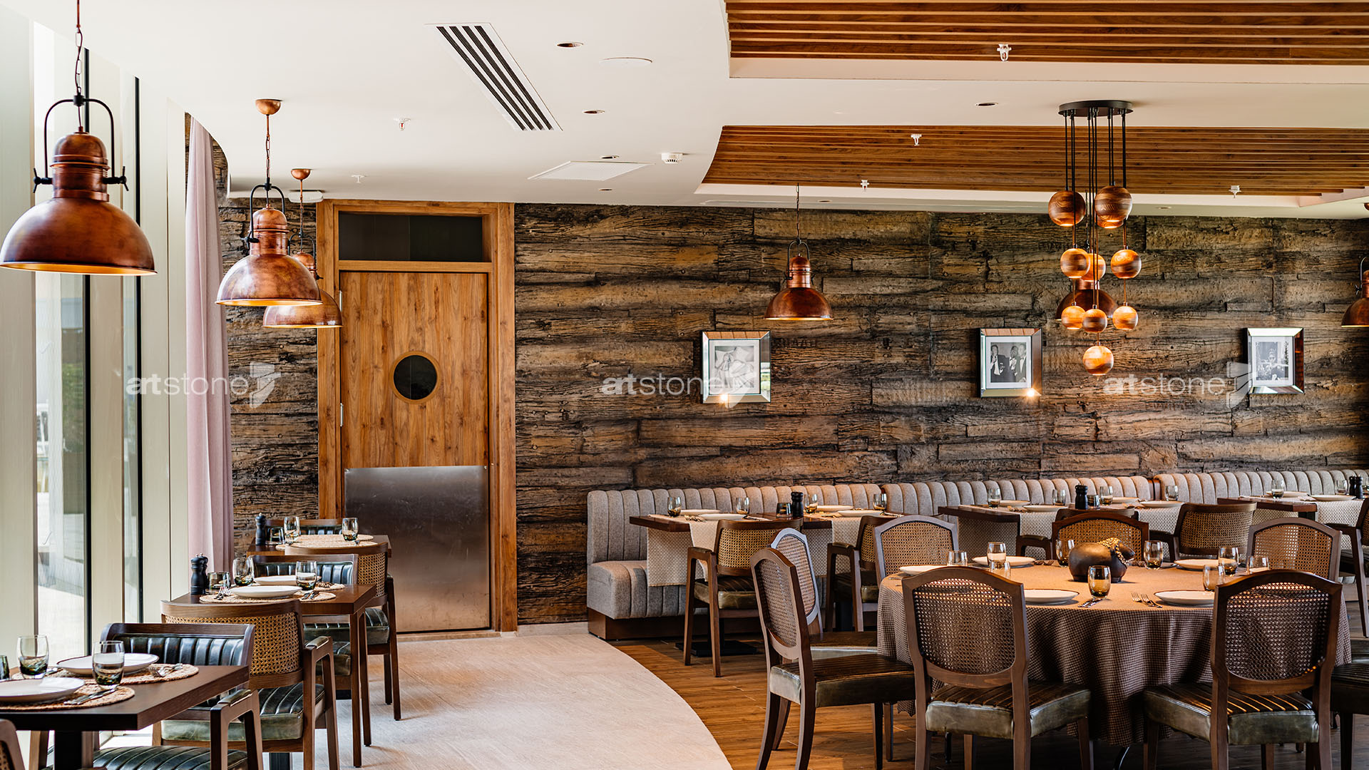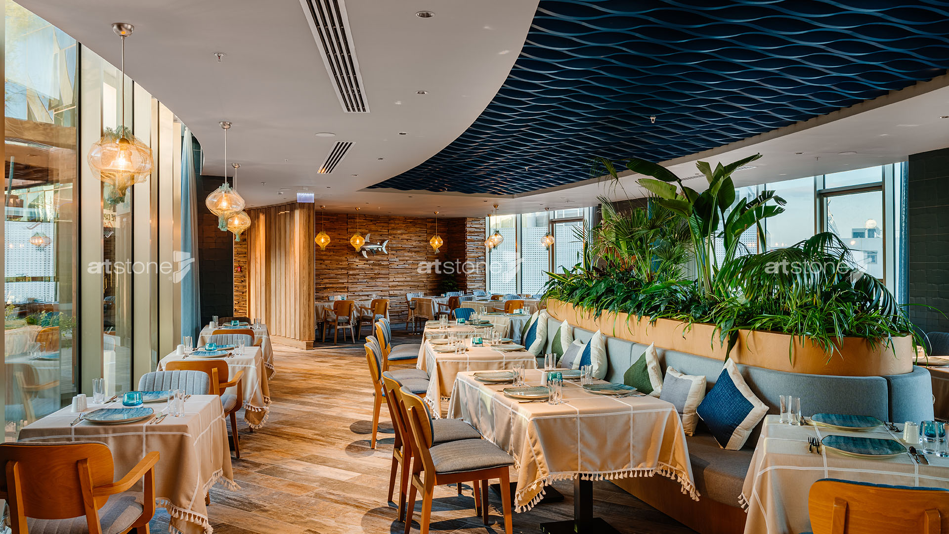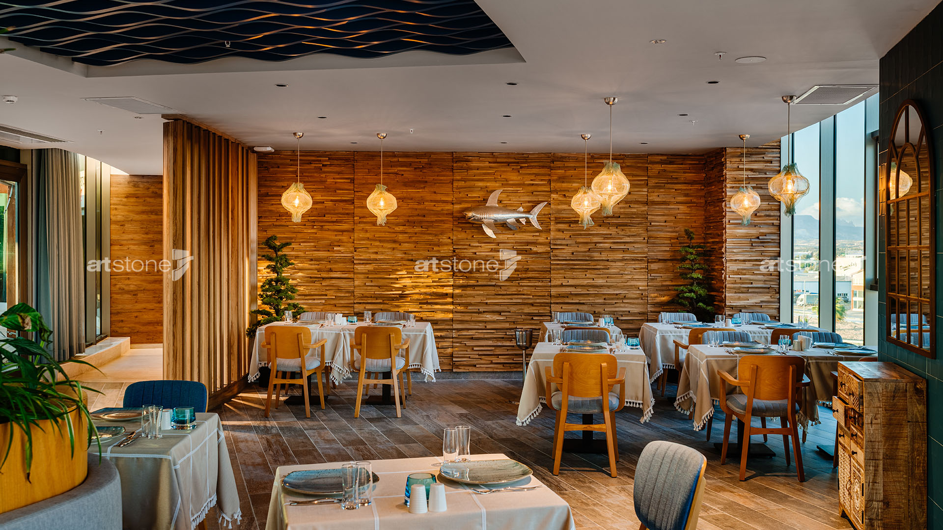 Kıbrıs’ın en gözde otellerinden biri olan Concorde Luxury Resort bünyesinde yer alan ve şehrin en popüler mekânları arasında bulunan The Capital Grill ve Vento Del Mare’in yüzeylerinde Artstone paneller tercih edildi. Üstün kalite anlayışı, ürün çeşitliliği ve uygulama kolaylığı sayesinde büyük projelerin tercihi olan Artstone paneller, etkileyici dokularıyla restoranların iç mekân tasarımında önemli bir rol üstleniyor.