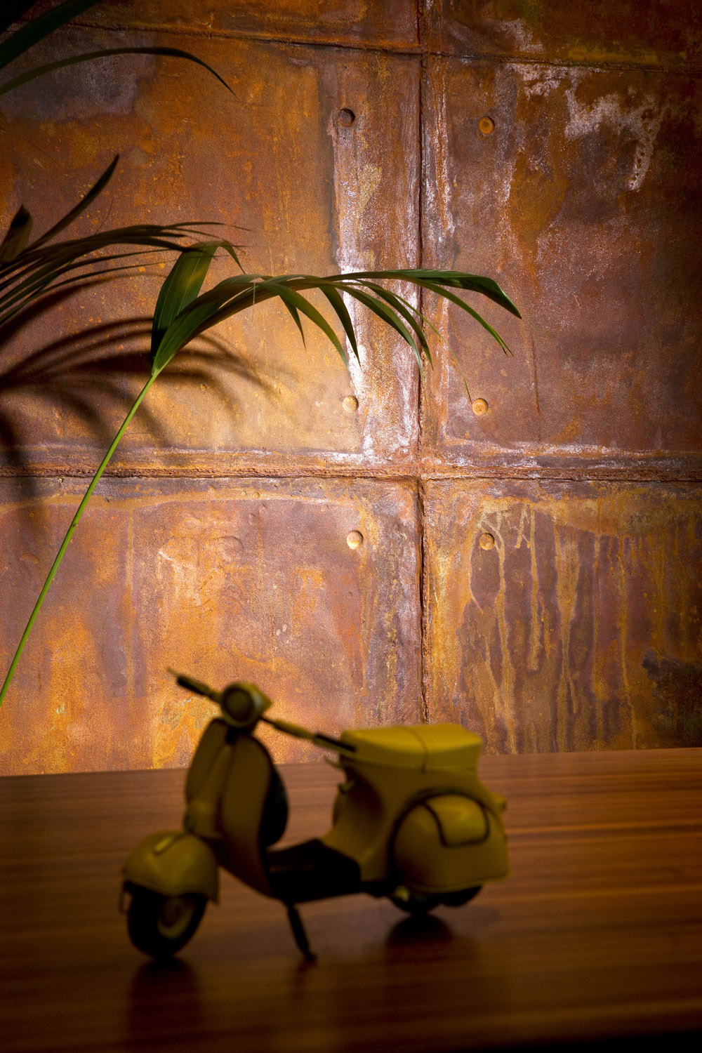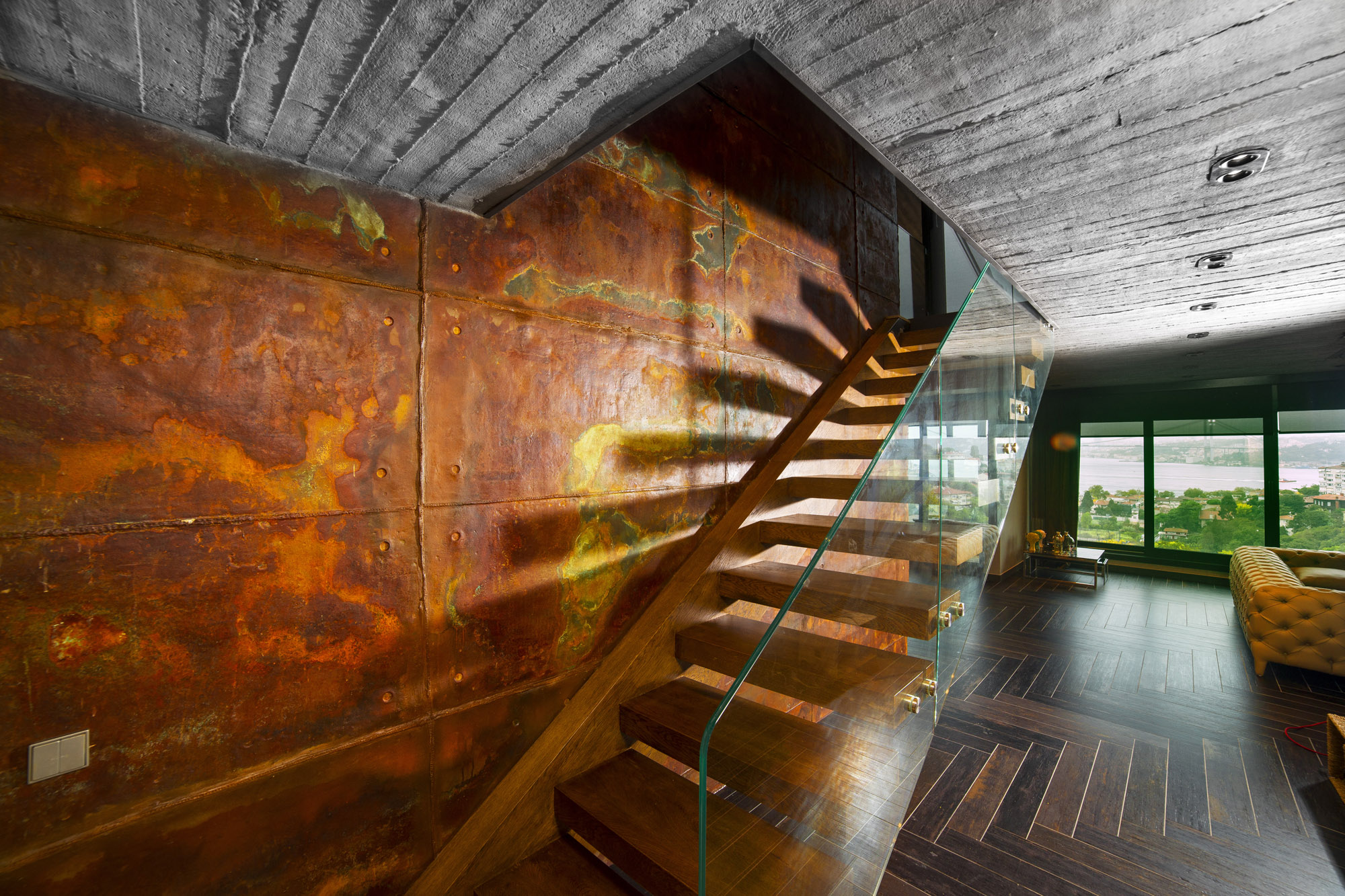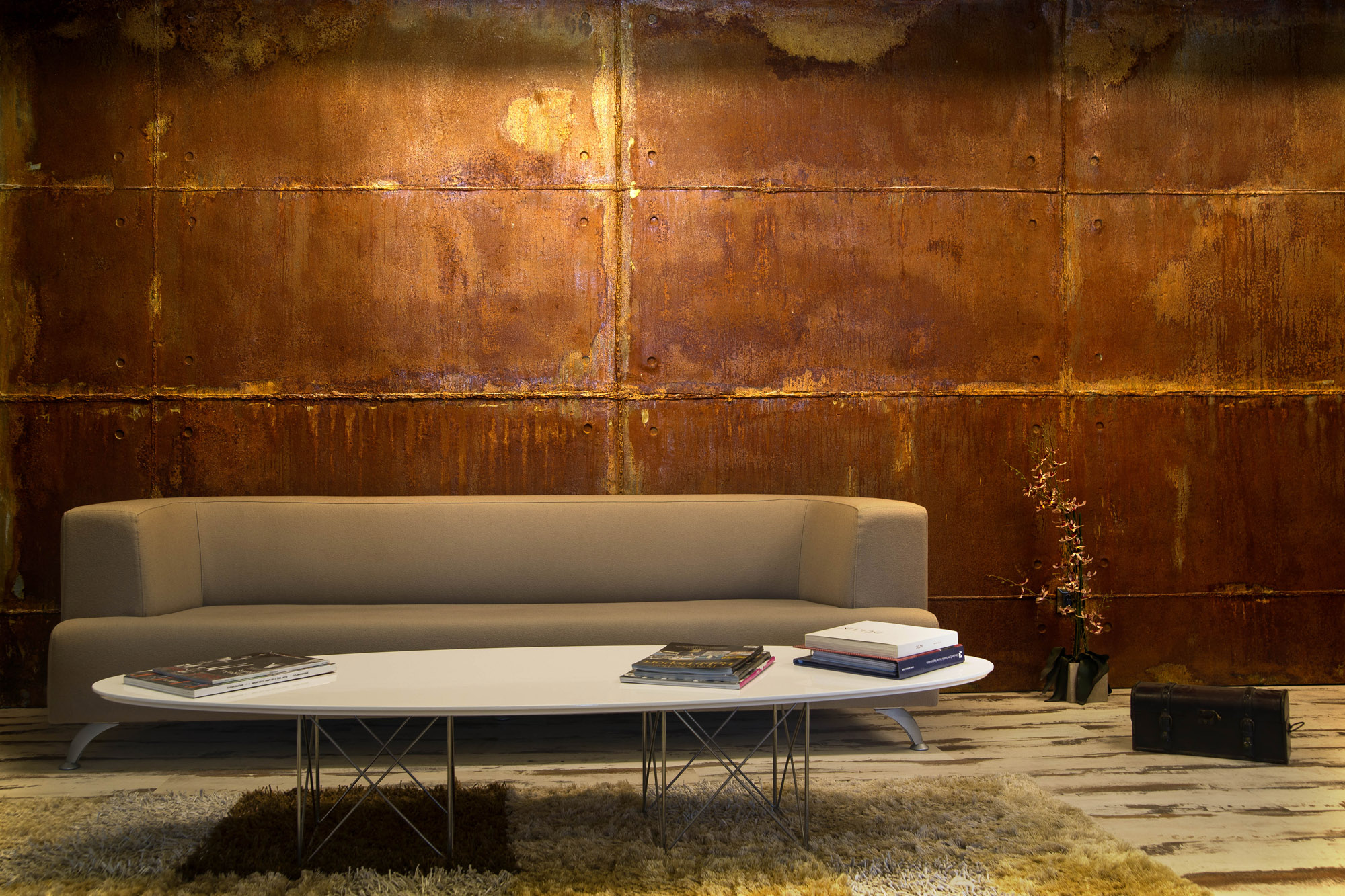 Oksitlenmiş yüzeyi, betonun dokunsal pürüzlülüğünü pasın sıcak ton geçişleriyle harmanlayarak belirgin bir endüstriyel estetik sunar.