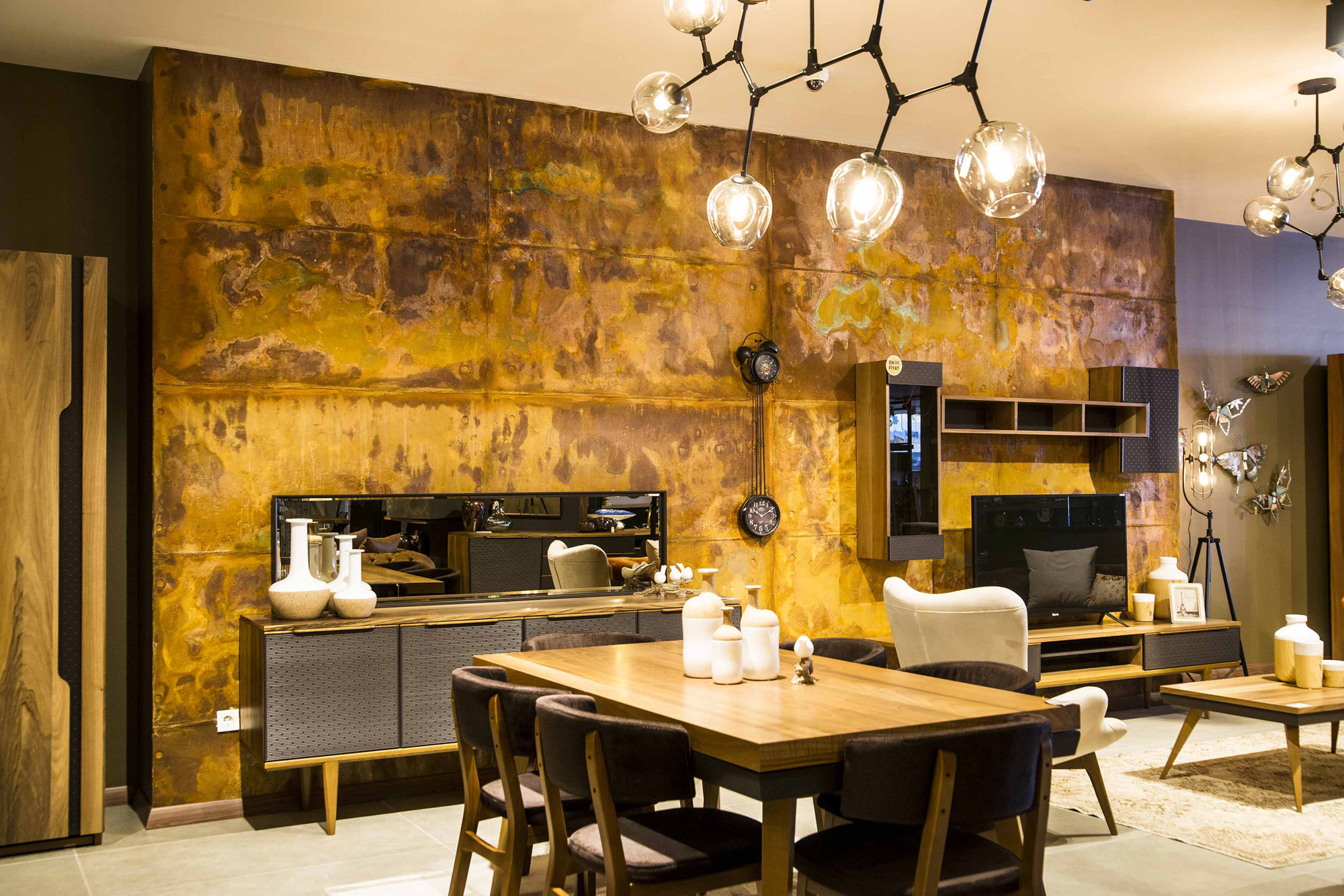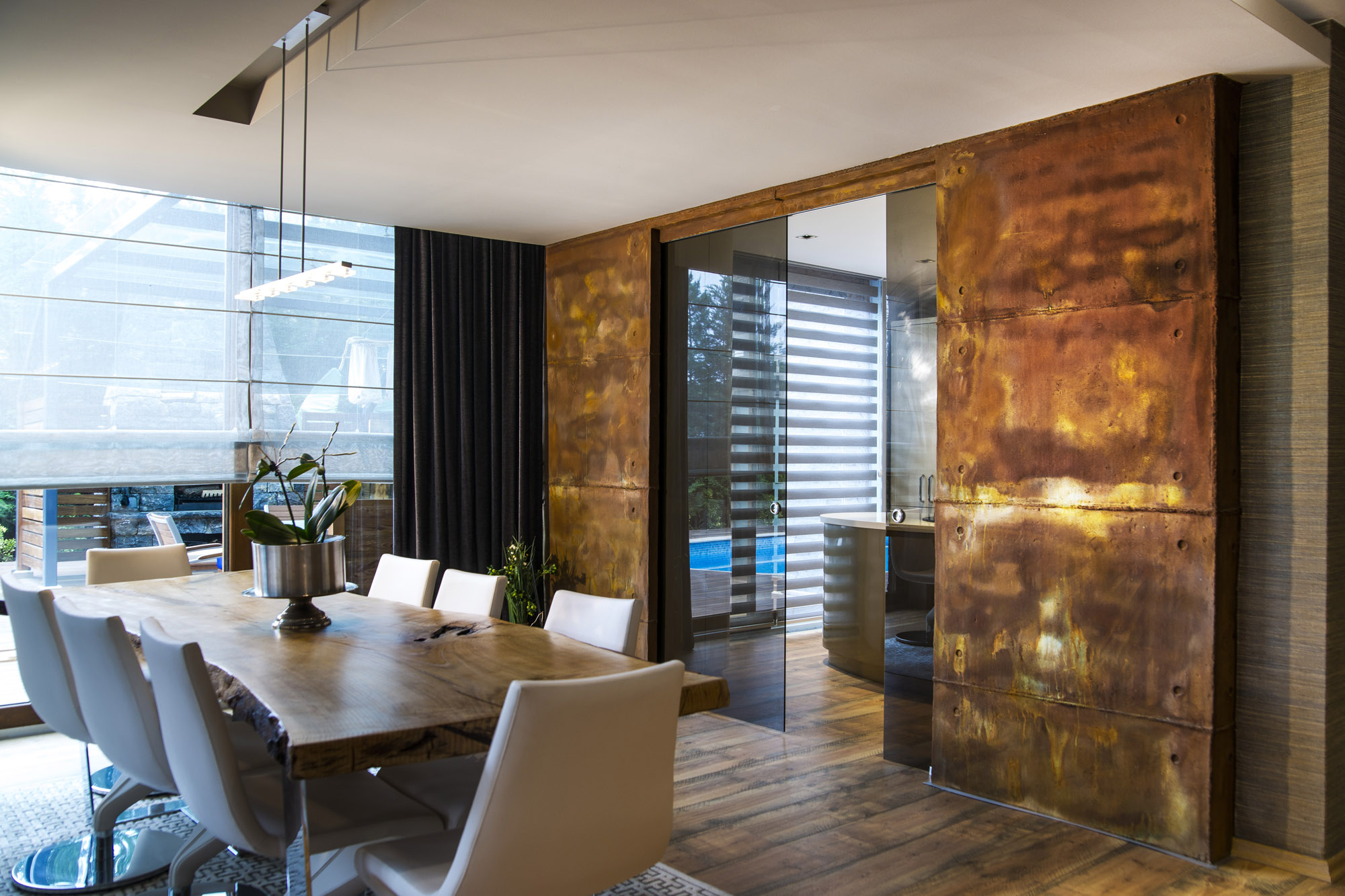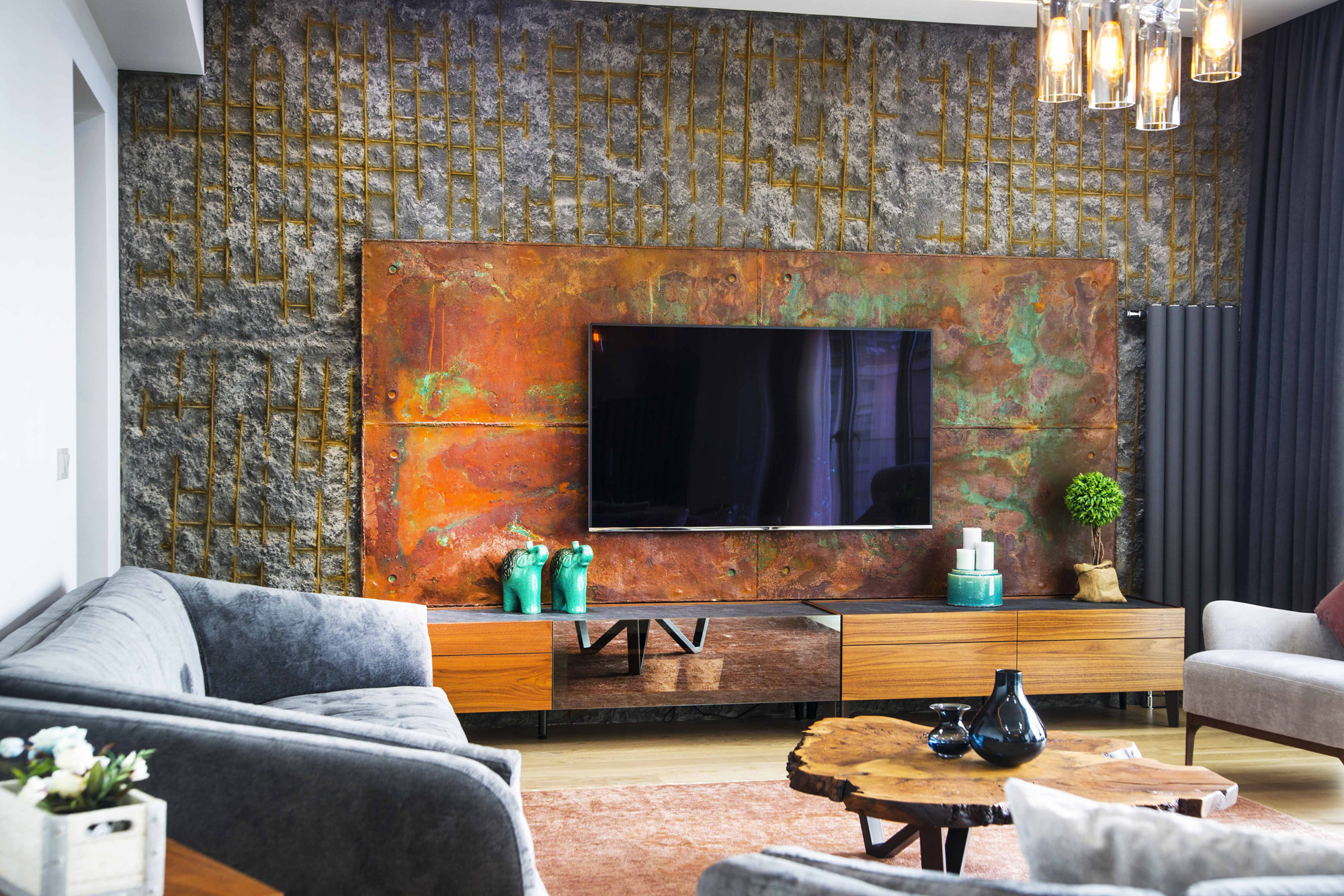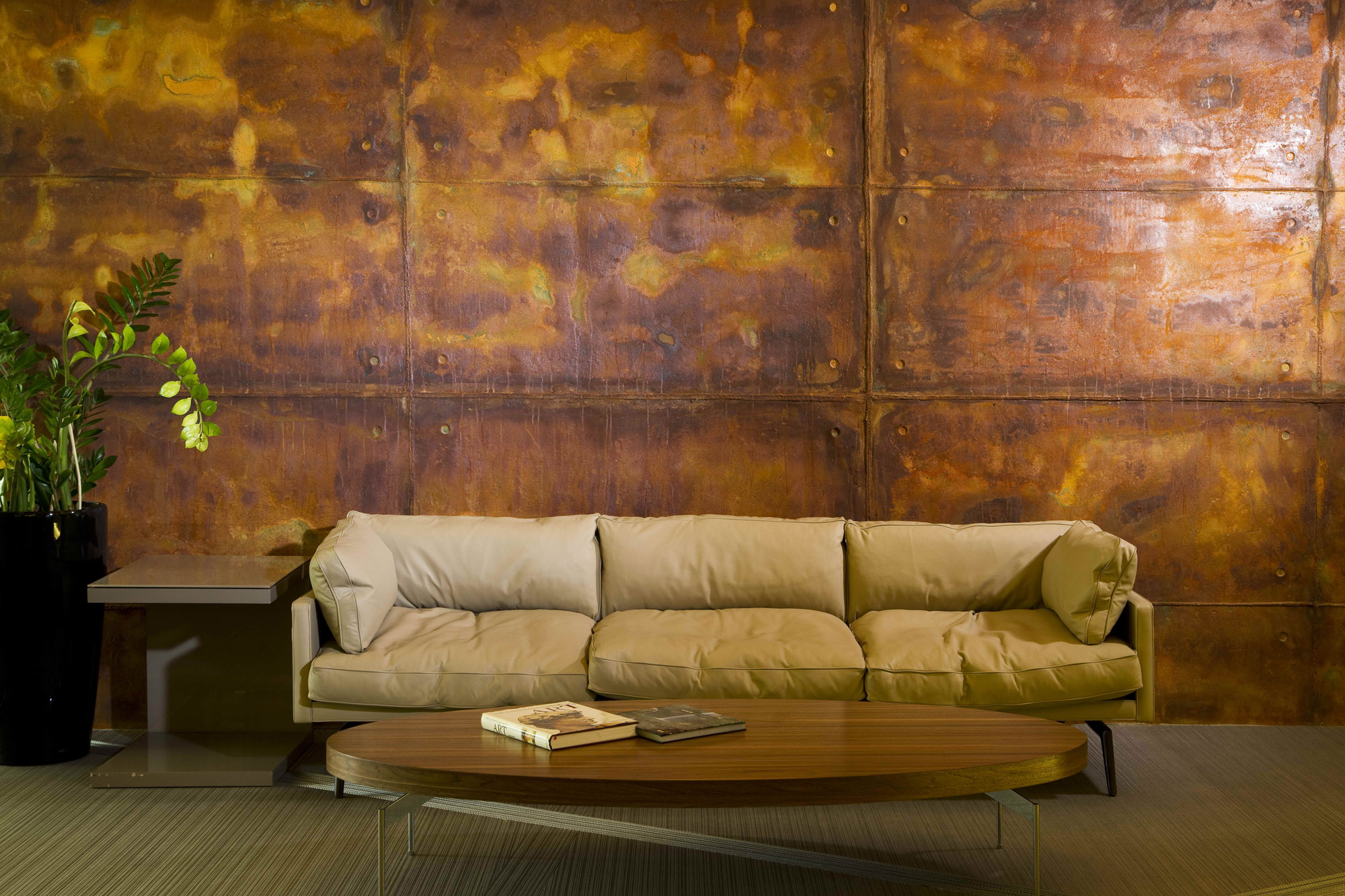 Oksitlenmiş yüzeyi, betonun dokunsal pürüzlülüğünü pasın sıcak ton geçişleriyle harmanlayarak belirgin bir endüstriyel estetik sunar.