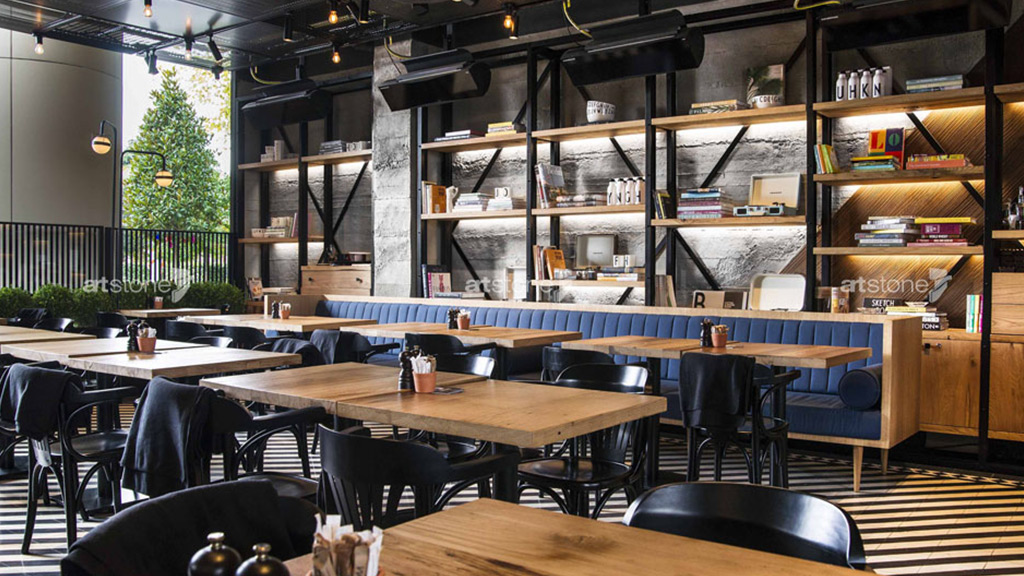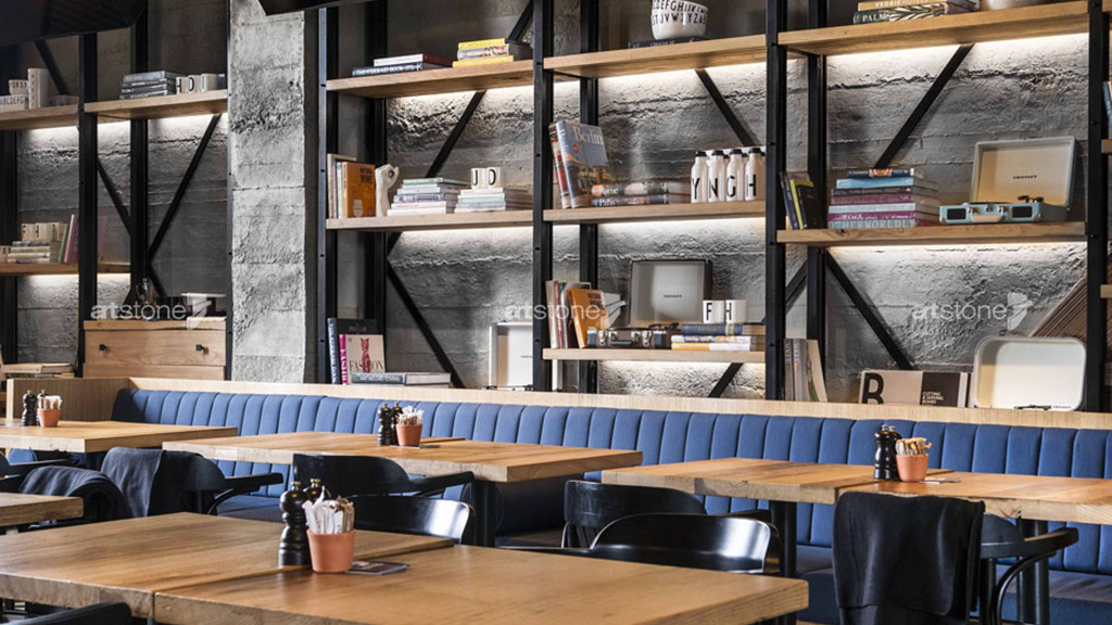 Kafenin yüzeylerinde tercih edilen Artstone beton serisi ürünlerinden Hormigon, sade üslubuyla mekândaki diğer mimari öğelere ev sahipliği yaparak bütüncül bir tasarım dili oluşturuyor.