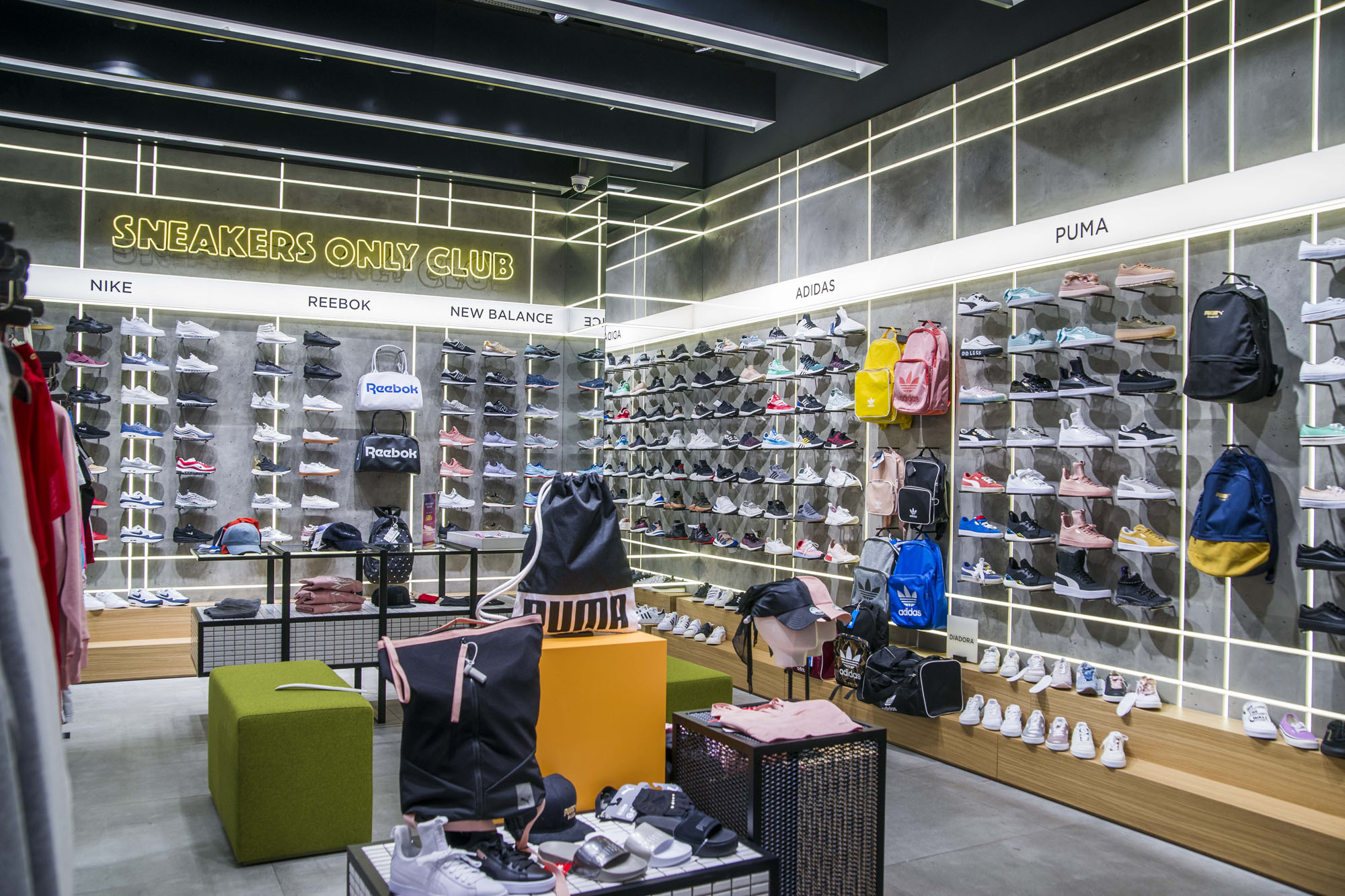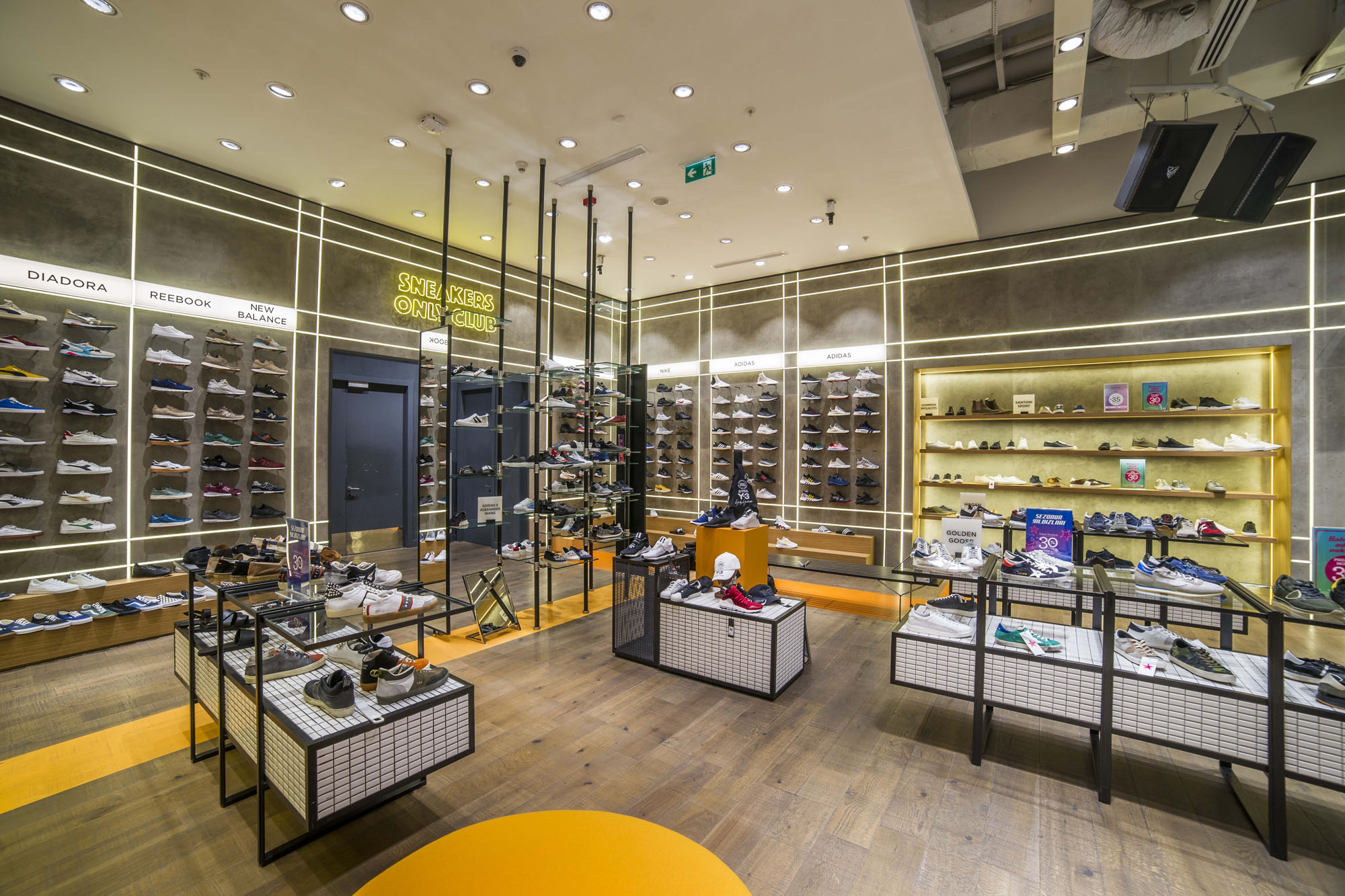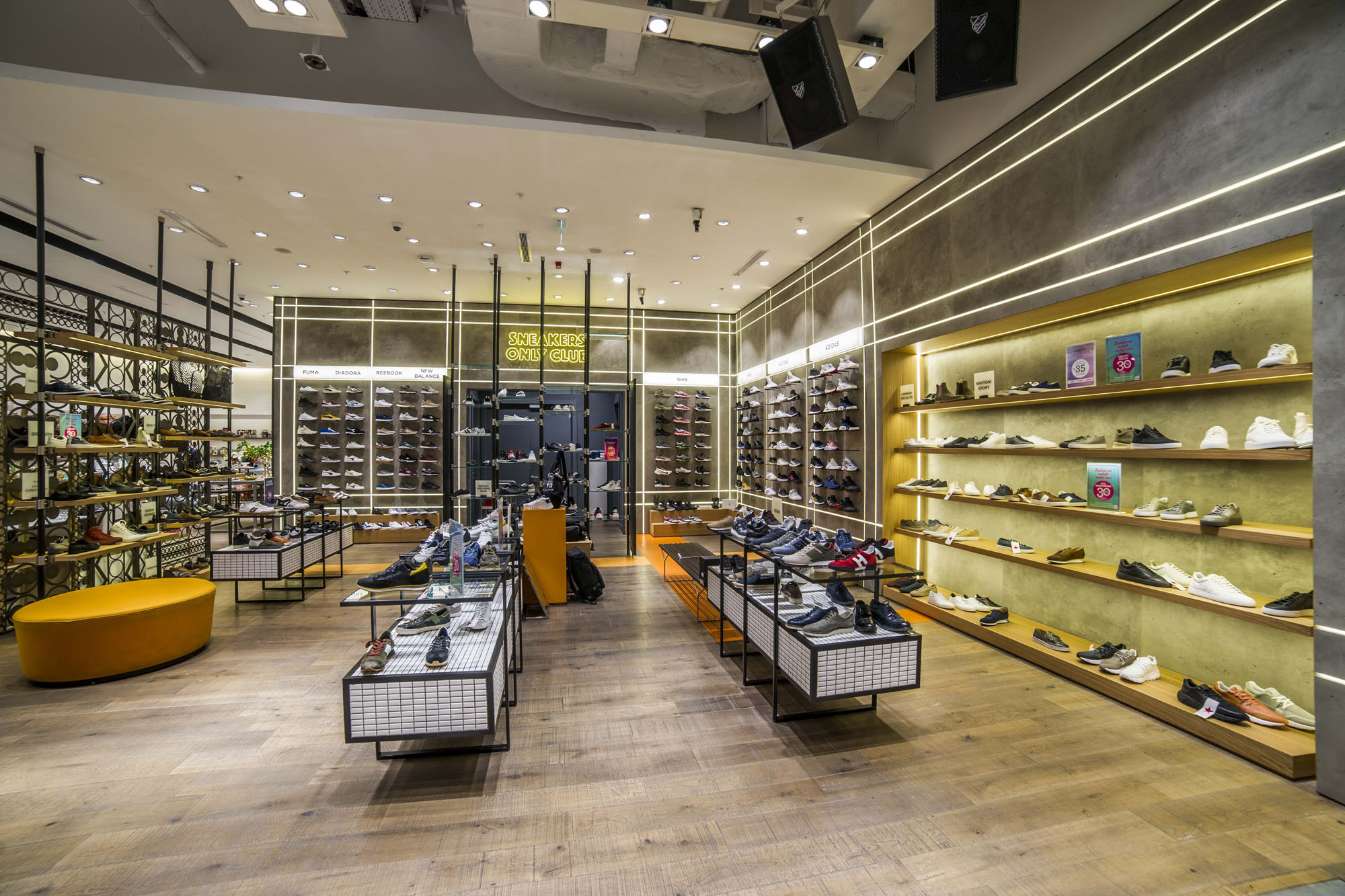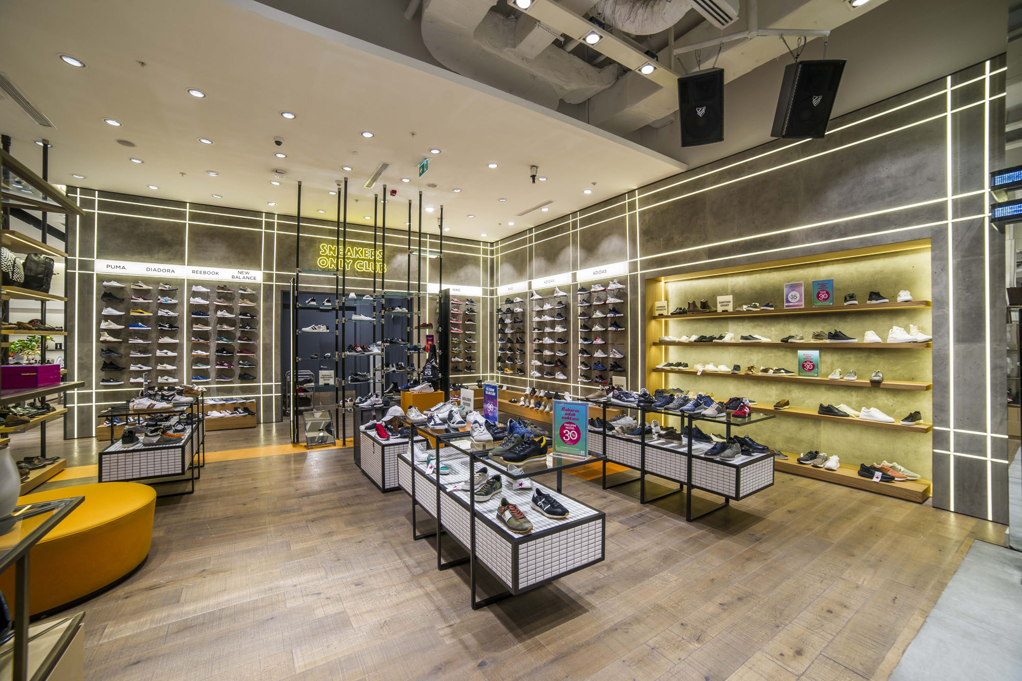 Phlox Serisi ile oluşturulan beton efektli duvarlar, yüzeylere entegre edilen lineer aydınlatma elemanlarıyla güçlendirilerek sergileme ünitelerinin sınırlarını net bir şekilde tanımlıyor. Bu yaklaşım, mobilya kullanımını minimuma indirirken, kullanılabilir alanı maksimize ediyor ve daha modern, açık ve ferah bir perakende ortamı ortaya koyuyor.