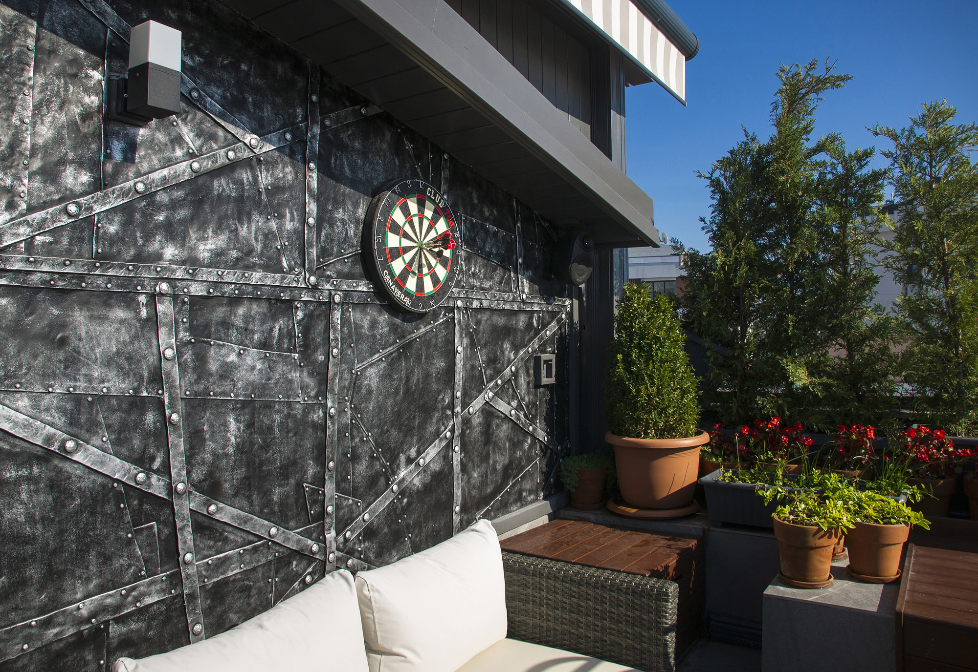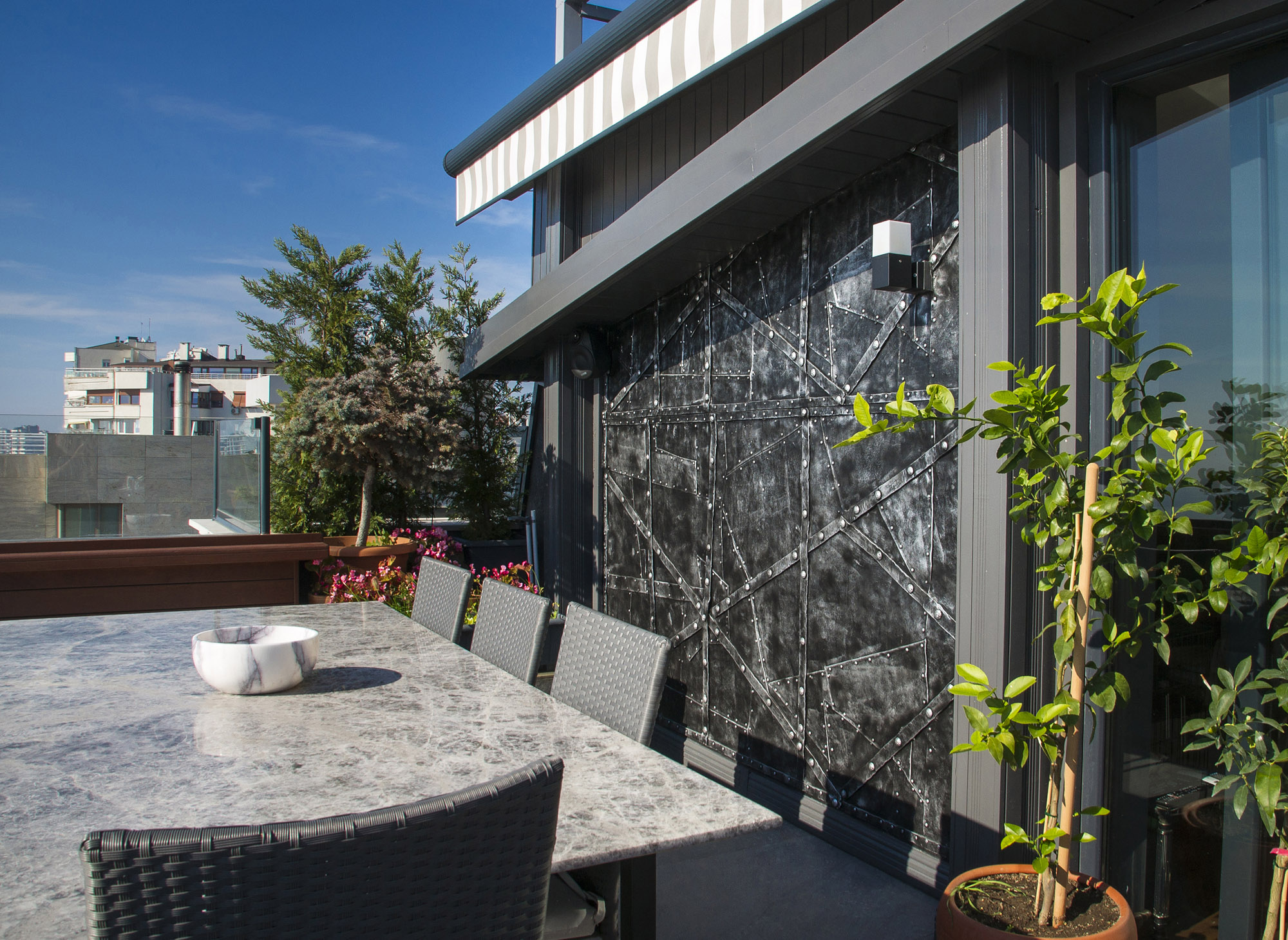 Çelik etkisi tasarımı, malzeme gücünü estetik bir dile dönüştürür. Rootz sadece kaplama olarak değil, mekanın genel atmosferini etkileyen merkezi bir tasarım öğesi olarak işlev görür.